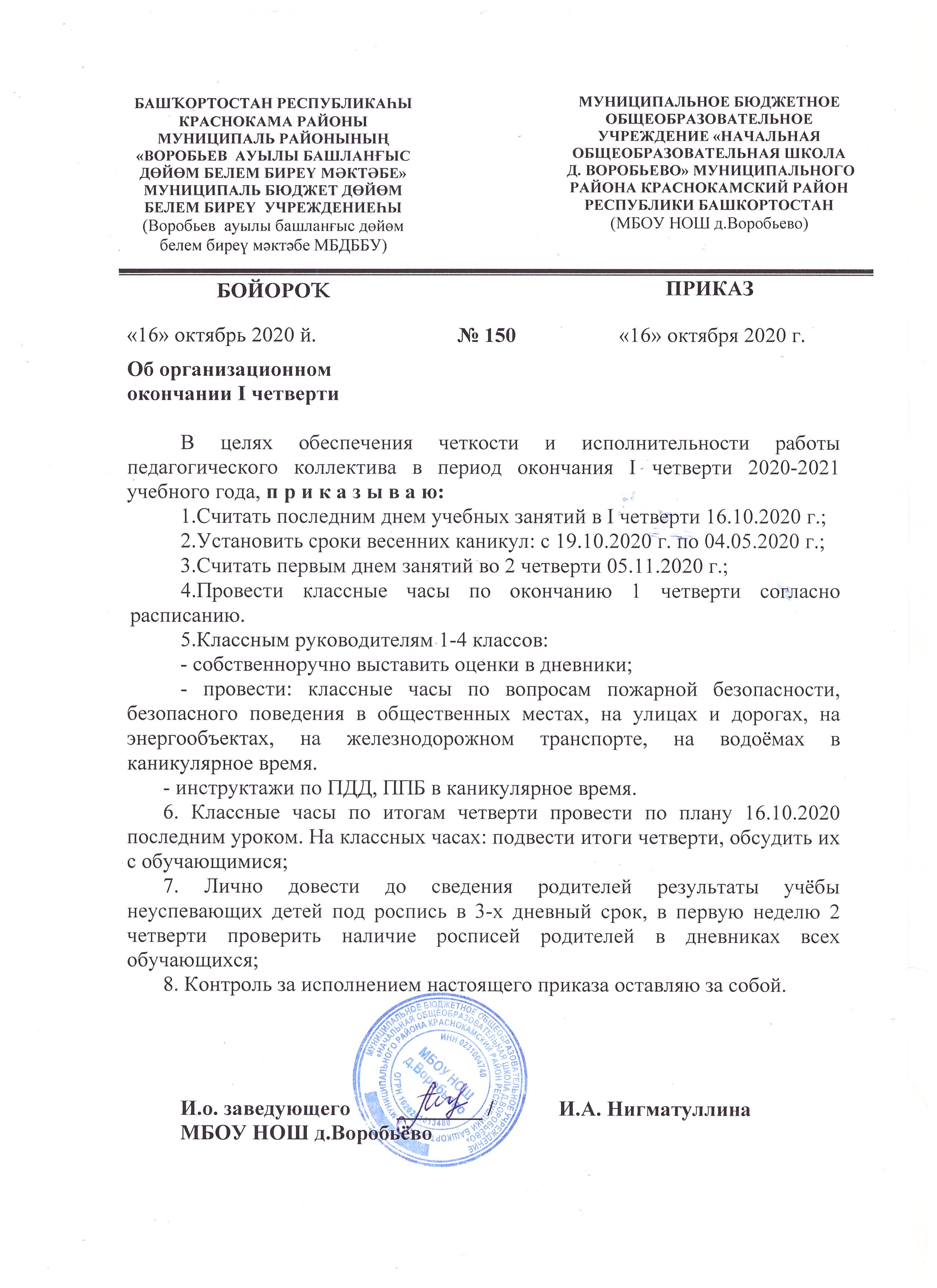 Приказ об организованном окончании 1 четверти